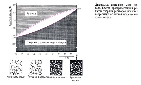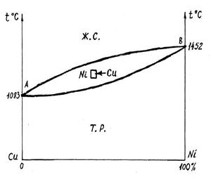 Сплавы кристаллизуются между линиями ликвидуса и солидуса. При охлаждении, в кристаллы более тугоплавкого никеля проникает медь, образуя твёрдый раствор меди в никеле.