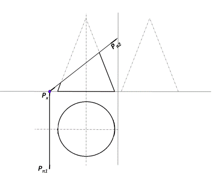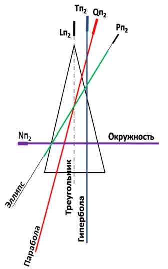 Конус является геометрическим телом, которое может иметь в сечении пять различных фигур: треугольник, если секущая плоскость Lп2 пересекает конус через вершину по двум образующим. Окружность, если секущая плоскость Nп2 параллельна основанию или перпендикулярна оси, а конус прямой круговой; эллипс, если секущая плоскость Рп2 пересекает все образующие конуса под некоторым углом к основанию конуса; параболу, если секущая плоскость Qп2 параллельна одной из образующих конуса; гиперболу, если секущая плоскость Tп2 параллельна оси конуса или параллельна двум его образующим.