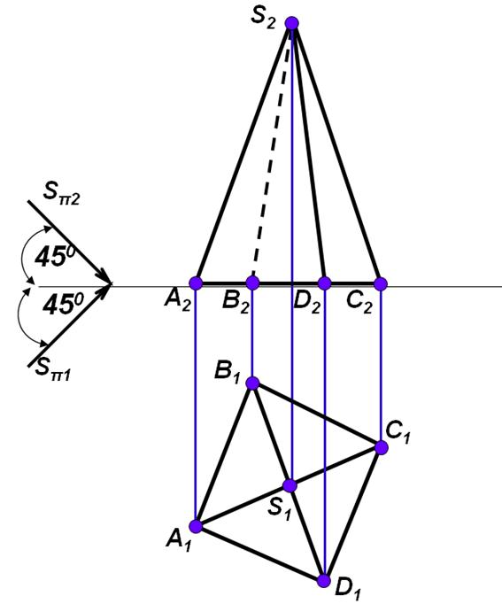 Строим действительную и мнимую тени от вершины пирамиды (Sп1)Sп2. Тень от точек основания совпадает со своими проекциями, т.е. В1 ≡ Вп1 D1 ≡ Dп1.