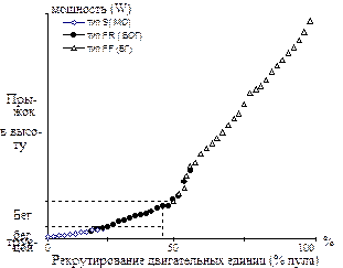 Рис. Рекрутирование ДЕ различного типа в зависимости от степени развиваемого мышечного напряжения при ходьбе, беге и прыжке.