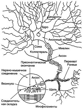 Рис.21. Идеализированный мотонейрон с четырьмя морфологическими участками: дендритами, сомой, аксоном и пресинаптическим окончанием.