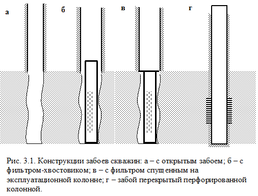 Если пласт сложен твердыми, хорошо сцементированными породами, то забой скважины оставляют открытым: эксплуатационная колонна спускается до кровли продуктивного пласта и цементируется. Разбуренный интервал от кровли до забоя скважины оставляют не обсаженным т.е. открытым. Рис. 3.1(а).