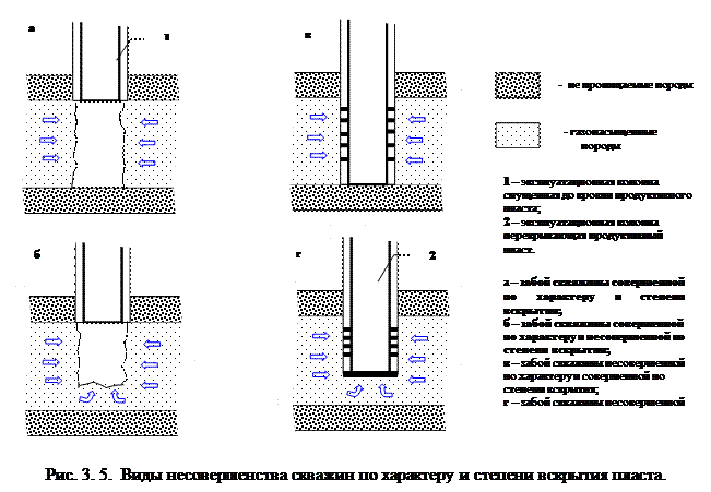В большинстве случаев скважины вскрывают пласт на всю его мощность, но сообщаются с пластом через ограниченное число перфорационных отверстий в эксплуатационной колонне. Такие скважины называются несовершенными по характеру вскрытия пласта рис.3.5 (в).