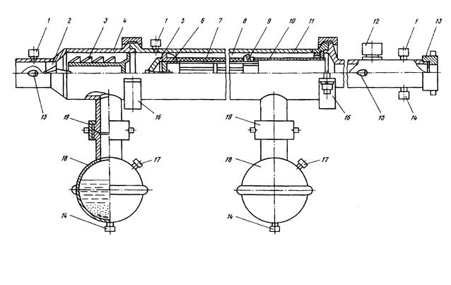1 - штуцера для замера давления; 2,6- центробежные завихрители; 3 - отбойник; 4,11 - корпуса; 5 - обтекатель; 7 - фильтрующий элемент; 8 - кольцевая камера; 9 - отбойник примесей; 10 - каркас фильтрующего элемента; 12 - заглушка; 13 - ДИКТ; 14 - вентиль; 15-термокарман; 16 - полухомут; 17 - штуцера для уравнительных трубок; 18 - контейнер; 19 - гайка накидная.