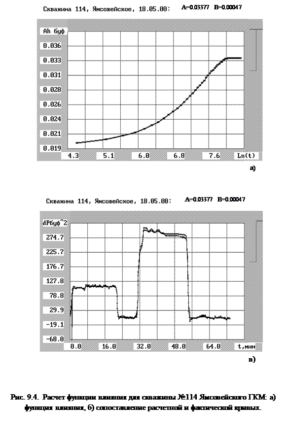 По результатам замеров строят функцию влияния (рис.9.4а.) и определяют значения фильтрационных коэффициентов. Основными критериями оценки результатов обработки служат два фактора: стабилизация значений функции влияния за время проведения исследований и хорошее согласование расчетных и фактических кривых изменения давления на устье скважины (рис.9.4б.)