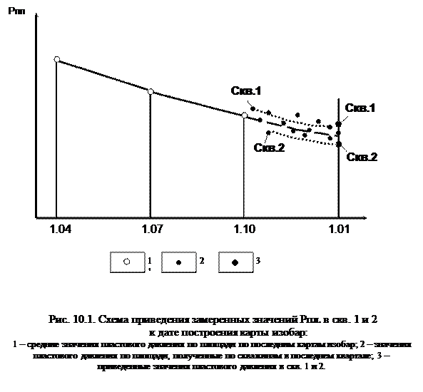 Приведение пластовых давлений по скважинам на дату построения карты изобар проще всего (для ориентировочных расчетов) осуществлять графическим методом, сущность которого заключается в следующем. Все замеры пластовых давлений на различные даты наносят в виде точек на график (рис. 10.1).