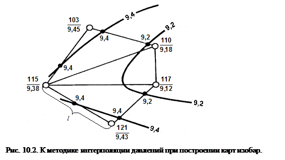 Процедура построения карты состоит из следующих операций: 1) на плане расположения скважин возле каждой из них надписываются значения определенных по ним приведенных пластовых давлений; 2) устанавливается интервал давлений, через который на карте будут проводиться изобары; 3) соседние скважины на плане попарно соединяются вспомогательными прямыми линиями, и на находят положение точек, через которые должны проходить изобары; 4) точки с одинаковыми значениями давлений соединяются плавными, не пересекающимися между собой линиями (рис.10.2).