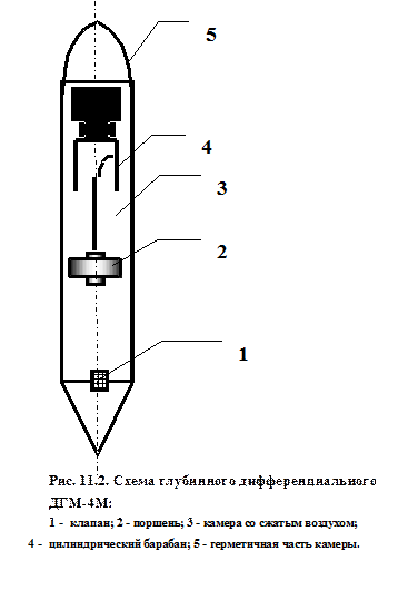 - пневматические или дифференциальные, типа ДГМ (рис. 11.2.), давление в скважине уравновешивается давлением сжатого воздуха, заполняющего специальную камеру.