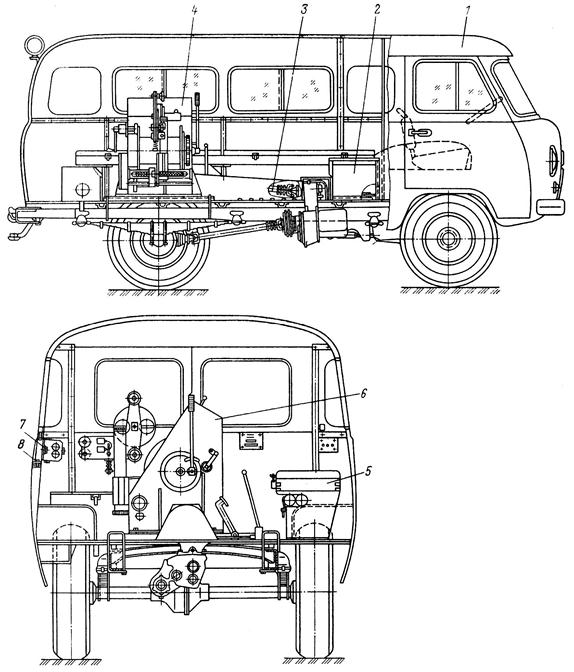 1 —автомобиль-фургон УАЗ-3741; 2—ящик для инструмента; 3—узел привода лебедки; 4— лебедка; 5— стеллаж; 6— механизмы дублирования управления муфтой сцепления и дроссельной заслонкой карбюратора автомобиля; 7—устройство для направления проволоки; 8 —люк для выхода рабочей проволоки.