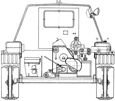 7–инструментальный ящик; 8— узел привода лебедки; 9— механизмы дублирования управления муфтой сцепления; 10— устройство для направления проволоки; 11 — отопитель.
