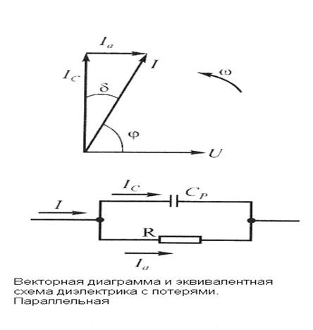 в) диэлектрические потери – возникают в виде потерь активной мощности в диэлектриках, работающих при переменном напряжении. Они проявляются в нагреве диэлектрика и характеризуются тангенсом угла диэлектрических потерь (tg δ).