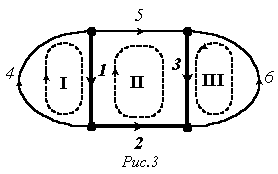 Рассмотрим пример составления контурных уравнений. Пусть имеем схему по рис. 2. Данная схема имеет четыре узла (m=4) и шесть обобщенных ветвей (n=6). Число независимых контуров, равное числу ветвей связи, c=n-m+1=6-4+1=3. Граф схемы с выбранным деревом (ветви 1, 2, 3) имеет вид по рис. 3.