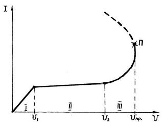 | I. - ток пропорционален напряжению, соблюдается закон Ома, свободные заряженные частицы постепенно втягиваются в направленное движение. II. - ток не зависит от напряжения. Все свободные заряженные частицы движутся направленно и скорость их растёт. III- скорость заряженных частиц резко возрастает, происходит явление ударной ионизации, заканчивающееся пробоем газа – точка П (I→∞; U→0) |