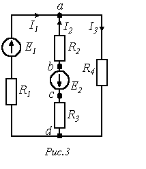 В этом случае с учетом того, что в электротехнике принято, что ток течет от большего потенциала к меньшему, потенциал искомой точки равен потенциалу предыдущей плюс падение напряжения на элементе между этими точками. Если на пути обхода встречается источник ЭДС, то потенциал искомой точки будет равен потенциалу предыдущей плюс величина этой ЭДС, если направление обхода совпадает с направлением ЭДС, и минус величина ЭДС, если не совпадает. Это вытекает из того, что напряжение на источнике ЭДС имеет направление, противоположное ЭДС. Обозначив на схеме по рис. 1 точки между элементами цепи e и a и приняв потенциал точки а за нуль(
