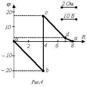 При параметрах схемы Построим потенциальную диаграмму для контура abcda. Для выбора масштаба по оси абсцисс просуммируем сопротивления резисторов вдоль рассматриваемого контура: