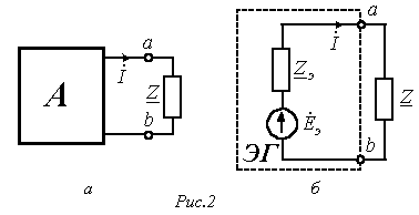 Таким образом, в соответствии с данной теоремой схему на рис. 2,а, где относительно ветви, ток в которой требуется определить, выделен активный двухполюсник А со структурой любой степени сложности, можно трансформировать в схему на рис. 2,б.