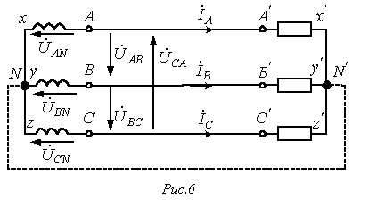 Линейным называется провод, соединяющий начала фаз обмотки генератора и приемника. Точка, в которой концы фаз соединяются в общий узел, называется нейтральной (на рис. 6 N и N’ – соответственно нейтральные точки генератора и нагрузки).
