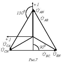 меняются местами). С учетом этого на основании соотношений (1) …(3) могут быть определены комплексы линейных напряжений. Однако при симметрии напряжений эти величины легко определяются непосредственно из векторной диаграммы на рис. 7. Направляя вещественную ось системы координат по вектору