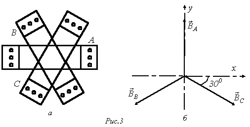 В соответствии с (5) и (6) и рис. 2,в для модуля вектора магнитной индукции результирующего поля трех катушек с током можно записать: