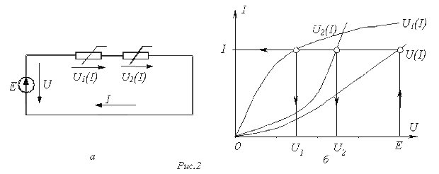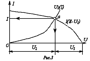 Графическое решение для последовательной нелинейной цепи с двумя резистивными элементами может быть проведено и другим методом –методом пересечений.В этом случае один из нелинейных резисторов, например, с ВАХ на рис.2,а, считается внутренним сопротивлением источника с ЭДС Е, а другой – нагрузкой. Тогда на основании соотношения точка а (см. рис. 3) пересечения кривых и определяет режим работы цепи. Кривая строится путем вычитания абсцисс ВАХ из ЭДС Е для различных значений тока.