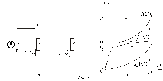 При параллельном соединении нелинейных резисторов в качестве общего аргумента принимается напряжение, приложенное к параллельно соединенным элементам. Расчет проводится в следующей последовательности. По заданным ВАХ отдельных резисторов в системе декартовых координат строится результирующая зависимость . Затем на оси токов откладывается точка, соответствующая в выбранном масштабе заданной величине тока источника на входе цепи (при наличии на входе цепи источника напряжения задача решается сразу путем восстановления перпендикуляра из точки, соответствующей заданному напряжению источника, до пересечения с ВАХ ), из которой восстанавливается перпендикуляр до пересечения с зависимостью . Из точки пересечения перпендикуляра с кривой опускается ортогональ на ось напряжений – полученная точка соответствует напряжению на нелинейных резисторах, по найденному значению которого с использованием зависимостей определяются токи в ветвях с отдельными резистивными элементами.