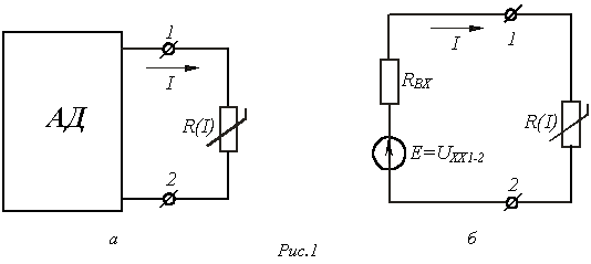 Если в сложной электрической цепи имеется одна ветвь с нелинейным резистором, то определение тока в ней можно проводить на основе теоремы об активном двухполюснике (методом эквивалентного генератора). Идея решения заключается в следующем. Ветвь, содержащая нелинейный резистор, выделяется из исходной цепи, а вся остальная, уже линейная, схема представляется в виде активного двухполюсника (АД). Согласно теореме об АД схему линейного АД по отношению к зажимам 1-2 выделенной ветви (см. рис. 1,а) можно представить эквивалентным генератором (см. рис. 1,б) с ЭДС, равной напряжению на зажимах 1-2 при разомкнутой ветви с нелинейным резистором, и внутренним сопротивлением, равным входному сопротивлению линейного двухполюсника. Последняя схема рассчитывается, например, графическим методом как цепь с последовательным соединением элементов.