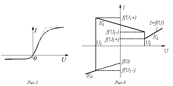 Метод кусочно-линейной аппроксимацииоснован на представлении характеристики нелинейного элемента отрезками прямых линий (см. рис. 3), в результате чего нелинейная цепь может быть описана линейными уравнениями с постоянными (в пределах каждого отрезка) коэффициентами.