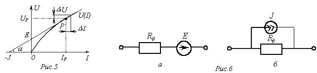 Идея метода заключается в замене нелинейного резистора линейным с сопротивлением, равным дифференциальному в заданной (или предполагаемой) рабочей точке, и либо последовательно включенным с ним источником ЭДС, либо параллельно включенным источником тока. Таким образом, линеаризованной ВАХ (см. прямую на рис. 5) соответствует последовательная (рис. 6,а) или параллельная (рис. 6,б) схема замещения нелинейного резистора.