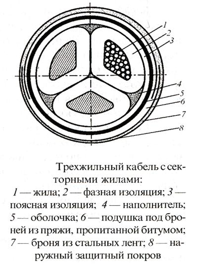 Токоведущие жилы – одно-, двух-, трех-, четырехжильные, материал –медь, алюминий. По конструкции – круглого и фасонного сечения (секторные и сегментные), одно – и многопроволочные.