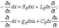 Под первичными параметрами линии будем понимать сопротивление , индуктивность , проводимость и емкость , отнесенные к единице ее длины. Для получения уравнений однородной линии разобьем ее на отдельные участки бесконечно малой длины со структурой, показанной на рис. 1.