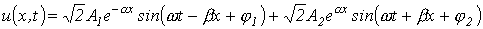Аналогичное уравнение согласно (6) можно записать для тока. Слагаемые в правой части соотношения (7) можно трактовать как бегущие волны: первая движется и затухает в направлении возрастания х, вторая – убывания. Действительно, в фиксированный момент времени каждое из слагаемых представляет собой затухающую (вследствие потерь энергии) гармоническую функцию координаты х, а в фиксированной точке – синусоидальную функцию времени.