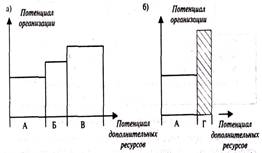 При варианте (рис.16) соединение хорошо совместимых двух ресурсов А и Г создает такой общий потенциал организации, который существенно перекрывает потенциал, полученный пи объединении трех ресурсов А, Б и В (рис. 1а). При этом величина самого ресурса Г существенно меньше суммы ресурсов Б и В.