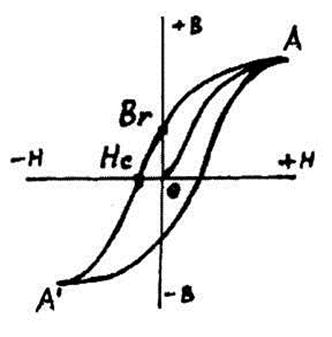 | ОА – кривая начального намагничивания, А и А' – точки магнитного насыщения материала, Вr – остаточная магнитная индукция, Нс – коэрцитивная сила, т.е напряжённость поля необходимая для полного размагничивания сердечника. |