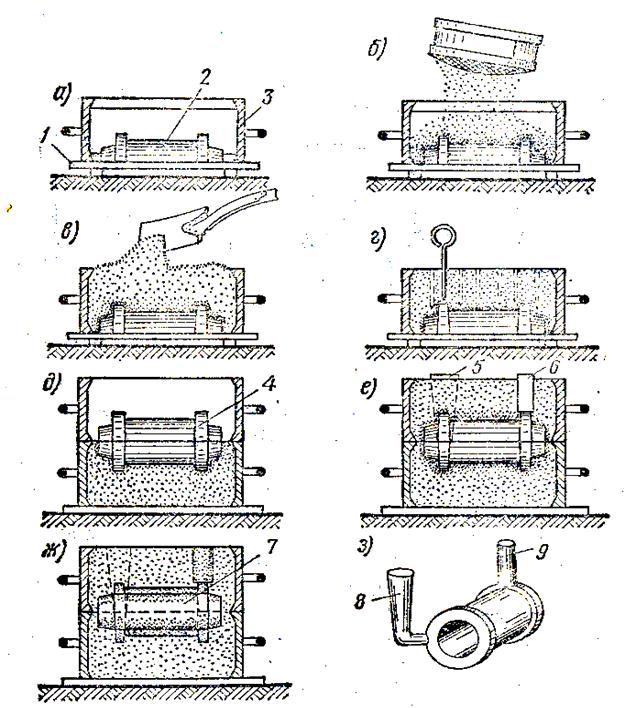 г) устанавливают на место изготовленные отдельно стержни, верхнюю опоку на нижнюю, скрепляют их и заливают металл.