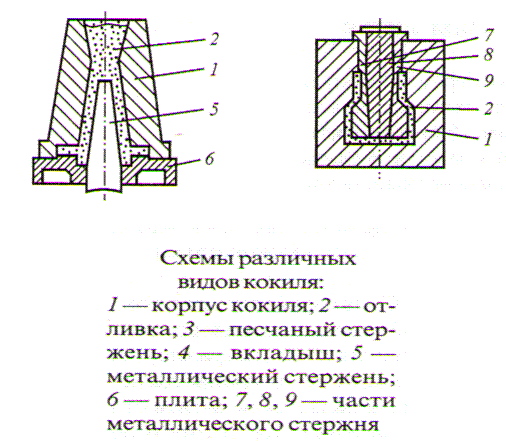 Отливка в металлические формы – кокили. Используют для получения точных отливок, чаще из сплавов цветных металлов. Кокили изготавливают из стали или чугуна. Перед заливкой металла их подогревают до 300 – 500 0С.