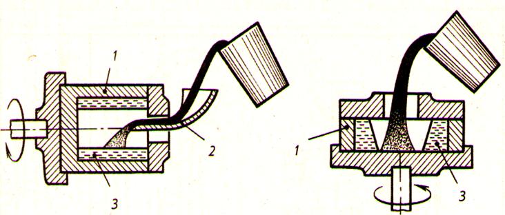 2) Центробежное литьё - жидкий металл заливают во вращающуюся форму (трубы, колёса, шкивы, втулки и т.п.)
