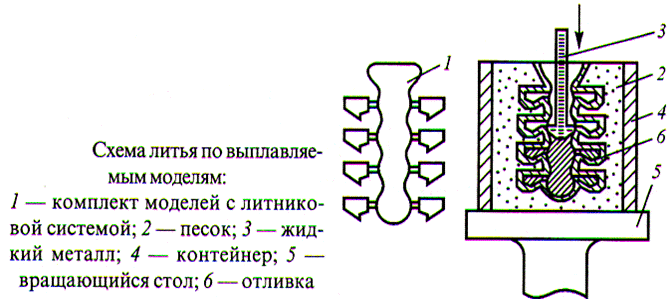 4) Литьё по выплавляемым или выжигаемым моделям - применяют для получения точных отливок сложной формы. Модели изготавливают из легкоплавких материалов (воск, парафин) или выжигаемых (пенопласт), затем их покрывают краской, опыляют корундовым порошком и заформовывают в опоке. Форму нагревают, модель расплавляется или выжигается и в полость формы заливают металл (режущие инструменты, лопатки газовых турбин и т.п.).