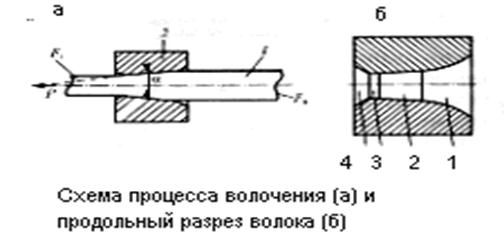 5) Волочение – протягивание холодной заготовки через сужающиеся отверстия – фильеры. Операции протяжки чередуют с отжигом - для снятия наклёпа.