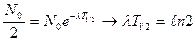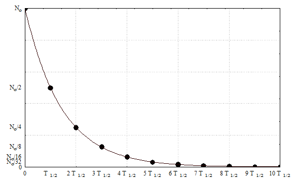 Если в основное уравнение радиоактивного распада подставить параметры периода полураспада: t = T1/2; Nt = N0/2, то получим уравнение