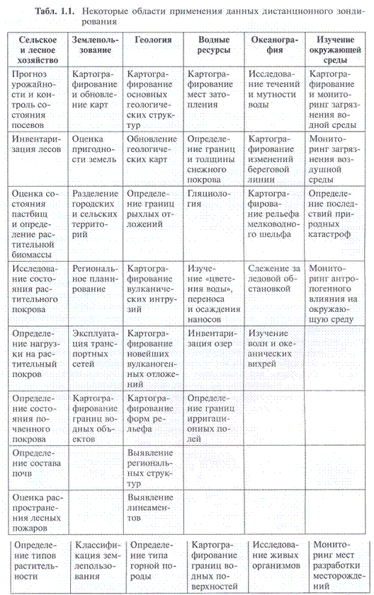 Поскольку ДЗ позволяет получать информацию о любых областях Земли, включая поверхность морей и океанов, сферы применения этого метода действительно безграничны (таблица 1.1.).