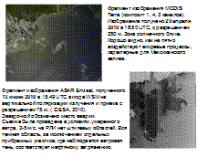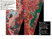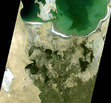 Амударья – крупнейшая река Средней Азии. Она берет начало на северном склоне Гиндукуша и впадает в Аральское море. Некогда полноводная река сильно обмелела. Сейчас ее воды не достигают Арала, теряясь в дельтовой области. Большая часть естественных озер и болот высохла, плавневые заросли сохранились только по берегам искусственных водоемов. Это в первую очередь связано с водозабором на орошение полей и понижением уровня Аральского моря. В орошаемой части дельты произошло заболачивание и образовались многочисленные озера, в неорошаемой – увеличилось опустынивание и засоление почв. Из-за катастрофических изменений природной среды для большей части дельты характерны ландшафты с угнетенной растительностью. На снимке со съемочной системы ETM+ спутника Landsat-7 отобразилась северная часть дельты Амударьи и южная часть Аральского моря. Снимок сделан 29 июля 2000 года в красной, зеленой и голубой зонах спектра. Черным цветом на территории дельты отобразились водные объекты. Их появление в первую очередь связано с антропогенной деятельностью – искусственным задерживанием воды системой дамб и каналов. Часто озера окружают заросли тростника, которые отобразились коричневым цветом. Оттенкам зеленого цвета соответствует наиболее здоровая растительность. Это свидетельствует о наличии оазиса в юго-восточной части снимка. Близость к песчаному цвету характеризует степень высыхания растительности. Для зоны осушения характерен полосчатый рисунок изображения, что связано с чередованием песчаных и илистых отложений. Желтым цветом на снимке выделяются пески, белым и оттенками голубого – участки засоления. С пустынной полосой в береговой зоне связано возникновение песчаных бурь, переносящих пески и соли в плодородную часть дельты. В западной части снимка – плато Устюрт. Оно представляет собой глинистую пустыню с отдельными пятнами солончаков. Один из них – сор Барсакельмес – отобразился на снимке белым цветом. На дорогах плато нарушен почвенный слой, поэтому они выделяются светлыми линиями.