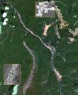 Добыча россыпного золота ведется драгами и артелями старателей. Артели отрабатывают небольшие россыпи по долинам рек. В этом случае грунты вскрываются с помощью бульдозеров, затем проводится промывка пород. Драги представляют собой передвижные минизаводы, которые отрабатывают более крупные россыпи. Они полностью перерабатывают днища долин, нарушая природные экосистемы. Глубина разработок составляет 6 – 8 метров при высоте отвалов до 6 – 10 метров. Следы работы драг отобразились в центральной части снимка: различимы светлые полосы отвалов, которые чередуются с темными канавами, заполненными водой. Рудное золото добывается карьерным способом. На снимке карьеры отобразились округлыми светлыми пятнами, которые сливаются в единое изображение. Площадь карьеров достигает нескольких сотен квадратных метров при глубине разработок до 10 метров. В этом случае руды перерабатываются химическим способом, что приводит к загрязнению поверхностных и подземных вод. Сейчас более половины золотодобычи обеспечивается именно карьерными разработками.