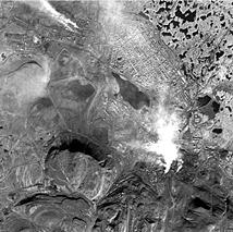 На черно-белом снимке EROS-A с разрешением 2 метра изображена часть одной из самых северных металлургических площадок мира, Норильского Промышленного Района с центром в городе Норильске. Город находится за Полярным кругом в Таймырском (Долгано-Ненецком) районе Красноярского края у подножия Норильских гор. Недалеко от гор протекает река Норильская, которая впадает в озеро Пясино. Непосредственно Норильск стоит на талике, то есть на замерзшем болоте глубиной 300 метров, подтверждая происхождение названия города и реки от эвенкийского слова «нарус» или юкагирского «ньорил», что означает «болота».