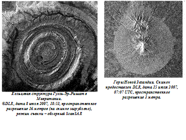 Кольцевая структура Гуэль-Эр-Ришат, видимая на снимке, располагается в Мавритании и имеет диаметр около 45 километров. Она известна с первых космических полётов, тем, что привлекала внимание космонавтов, для которых была четким и легко узнаваемым земным ориентиром во время нахождения на орбите. Она образовалась в период между поздним протерозоем и ордовиком (самому древнему кольцу – 0,5-0,6 миллиардов лет). Возвысившийся первоначально в центре массив из известняка, доломитов и брекчий в последствии провалился. Метеоритная гипотеза происхождения кратера до сих пор еще подвергается сомнению.