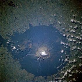 Последний раз извержение вулкана Эгмонт происходило в 1755 г., и теперь он располагается в центре заповедника Эгмонт. Заповедник был создан, чтобы обеспечить сохранение леса в радиусе 9,5 км. от вершины вулкана, что из космоса выглядит как огромный темно-зеленый диск. Снимок был сделан во время экспедиции STS-110 в апреле 2002 г.