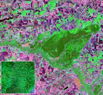 На снимке, на фоне типичного рисунка сельскохозяйственных полей, ясно выделяется лесной массив, имеющий насыщенную зеленую окраску и достаточно четкие границы. Это – уникальное природное образование – Бузулукский бор.