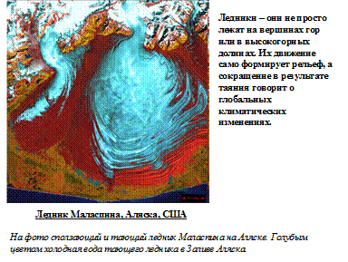 Медвежий ледник на Аляске. Напоминающие осколки матового стекла куски льда отваливаются в озеро по мере сползания туда всего массива льда. А темные полосы – это грязь и камни, которые захвачены льдом по пути