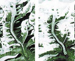 Космические снимки ледника Октябрьского 1985 г. (слева) и 1990 г. позволяют увидеть изменения его морфологии в результате мощной подвижки, измерить смещение его языка и характерных точек на поверхности, вычислить скорость движения льда.
