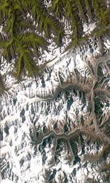 На этом снимке растительность показана зеленым цветом. Верхние части хребтов, где травянистый покров сильно разрежен и голые скалы преобладают, отражены коричневым цветом. При этом вершины покрытые снегом - белые. Очень хорошо видна структура хребтов, из-за теневой отмывки: тени от хребтов подчеркивают все, даже очень маленькие отроги. При этом следует помнить, что солнце светит справа (т.е. с востока), т.к. это первая половина дня, и, значит, линия хребта проходит по границе - слева тень, а справа - освещенная часть. Соответственно, если справа темный склон, а слева - светлый, то это ущелье или распадок, в днище которого течет река. В горах, за исключением сильно засушливых районов, в распадках обычно текут реки и ручьи. Да и сами распадки являются речными долинами и в их формировании (кроме геологических причин) большая роль принадлежит водотокам.