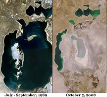 В северной части снимка – остров Возрождения. Возможно, при дальнейшем понижении уровня моря он увеличится и разделит Арал на западную и восточную части. На снимке отобразился узкий пролив, соединяющий их с юга. Глубина моря также прослеживается по снимку: минимальная характеризуется светлыми оттенками зеленого, максимальная отображается наиболее темной.